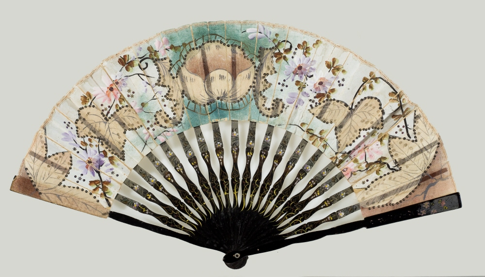 Abanico plegable con varillaje (19 + 2) de madera, gasa y papel. En el anverso, la fuente está calada, lacada en negro y pintada con motivos vegetales y florales en diversos tonos. El reverso no posee decoración pictórica. Las guardas están lacadas en negro y pintadas en el extremo superior con motivos vegetales y florales. El país es doble, en el anverso, se intercala el papel pintado con témpera con motivos florales y la gasa de color marrón que está delimitando contornos con formas vegetales mediante pequeñas aplicaciones de lentejuelas redondas, en origen, de color dorado. El reverso es de gasa color marrón, sin ningún tipo de decoración. El ribete en el anverso, es un hilo color marfil a modo de pasamanería. El clavillo y la virola probablemente fueran de metal plateado, en la actualidad están oxidados. Vuelo: 160°.
