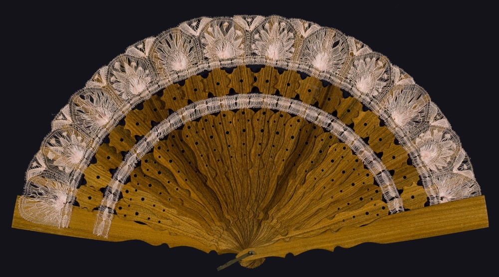 Abanico tipo plegable. Serie cabriolet. Estilo modernista. Varillaje de madera. País montado a la inglesa, de encaje (manual ?) rosa. Clavillo y anilla de metal. Vuelo: 160°
