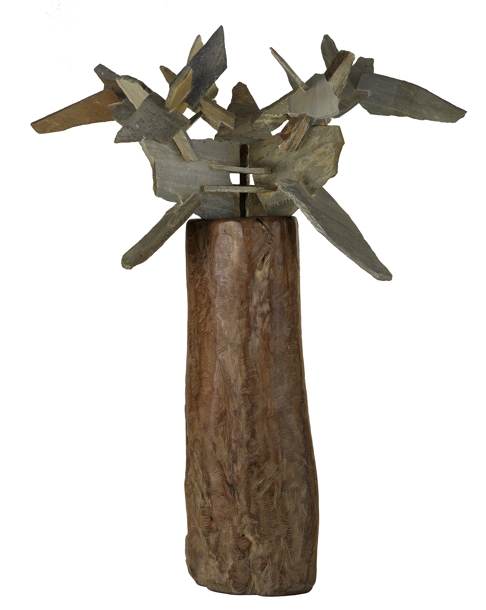 Esta obra de Manolo Paz, uno de los principales exponentes de la escultura contemporánea en Galicia, que formó parte del grupo Atlántica en los años ochenta, se enmarca dentro de una nueva etapa gestada a raíz de su estancia en Nueva York en los años noventa. Se percibe en ella un nuevo modo de combinar las propiedades de los materiales, de la desnudez de la piedra con las del voluminoso tronco de madera que actúa como pedestal y aporta la línea de fuerza. Consigue que el espacio gire en torno a la escultura gracias al juego expansivo de las lascas ensambladas entre sí que matiza el peso de la madera.