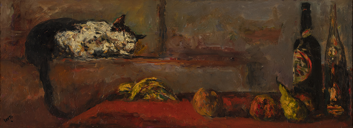 Imaxe: Descargar Escuchar Bodegón con gato y botellas Autores/as: Souto, Arturo Cronología: 1958 [ca] - 1960 [ca] Ficha técnica Número de inventario: 6513 Materia / Soporte: Lienzo Autores/as: Souto, Arturo Cronología: 1958 [ca] - 1960 [ca] Clasificación: Pintura Iconografía: Bodegón Procedencia: Donación de Elvira Álvarez Vega Medidas: 36x96 cm Técnica: Pintura al óleo Objeto: Cuadro