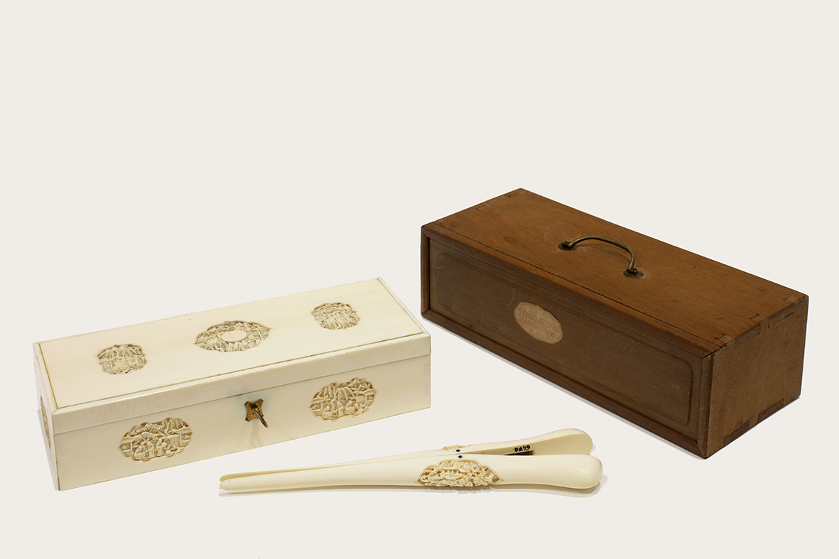 La delicada talla del marfil tiene las características de los talleres cantoneses de China. Cantón era el principal centro de producción de marfil y de exportación de piezas. A partir del siglo XIX al intensificarse las relaciones comerciales de los países occidentales con Asia aumentó la llegada de sus productos artísticos y la apertura de puntos de venta en diversas ciudades occidentales. El gusto por el orientalismo y el exotismo de China y Japón, característicos del romanticismo, invitaban al coleccionismo de piezas decorativas de Asia Oriental en la segunda mitad del siglo XIX y primeras décadas del XX. Son una muestra del gusto burgués por los objetos artísticos orientales. Este coleccionismo se vio favorecido durante la segunda mitad del siglo XIX y primeras décadas del XX por la celebración de exposiciones universales donde la presencia de los pabellones chinos fueron muy populares y también por la difusión de la cultura oriental a través de la prensa europea.