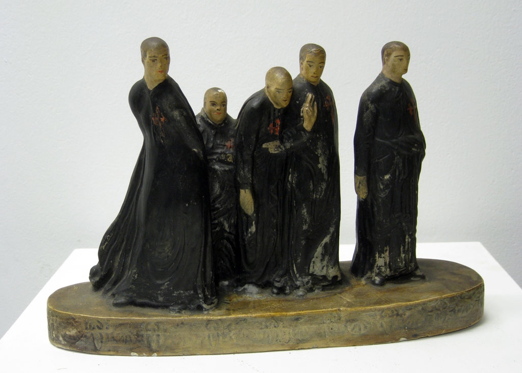 Esta pieza es una creación de Francisco Asorey, colaborador de la fábrica junto a otros escultores y pintores gallegos. La realiza en 1934 inspirándose en una escultura en madera policromada de su primera época, Caballeros negros, modelada en el Año Santo de 1915 según una inscripción que conserva el boceto, que presentaría en el Salón de Humoristas de Madrid de 1916 y en la Exposición Regional de A Coruña de 1917. Este conjunto se relacionó en numerosas ocasiones con obras como Los burgueses de Calais de Rodin (La escultura en madera está citada y reproducida en el Catálogo de Exposición, Centenario Francisco Asorey, Museo do Pobo Galego, Santiago de Compostela, 1989, p. 45, Lám. 7.)