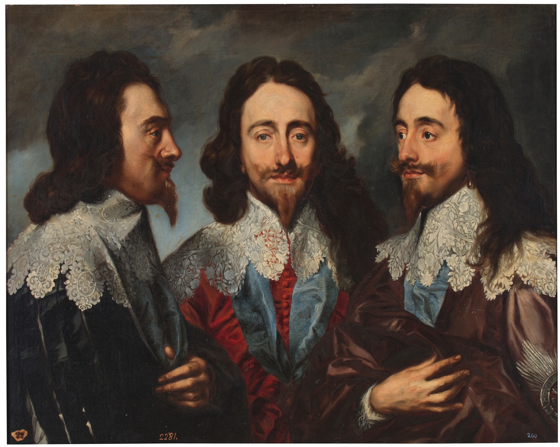 Retrato de Carlos I de Inglaterra de medio cuerpo y en tres posiciones: de frente y dos de perfil. Viste de negro, rojo y lila sucesivamente, con valona blanca bordada. En el brazo del busto situado a la derecha aparece parte de la estrella de ocho puntas que es un emblema unido a la Orden de la Jarretera, una de las órdenes de caballería más antigua del Reino Unido. La imagen de Carlos I de frente, perfil y tres cuartos, fue encargada a Van Dyck con la finalidad de enviarla a Bernini para que ejecutara un busto en mármol del monarca. La obra original pintada por Van Dyck hacia 1635-1636 forma parte de la Colección Real inglesa.