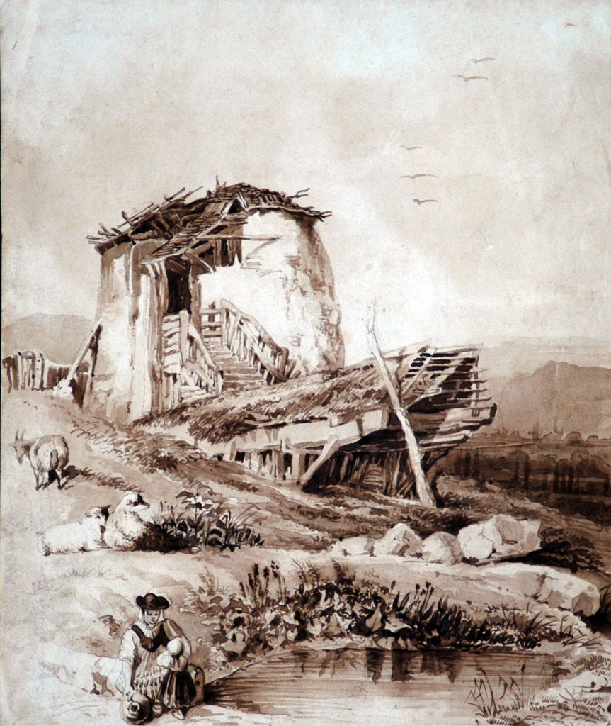 Cabaña con el tejado semiderruido situada en una pendiente. En primer término, un arroyo o pozo natural en cuya orilla, una joven con una niña coge agua con unos cántaros.