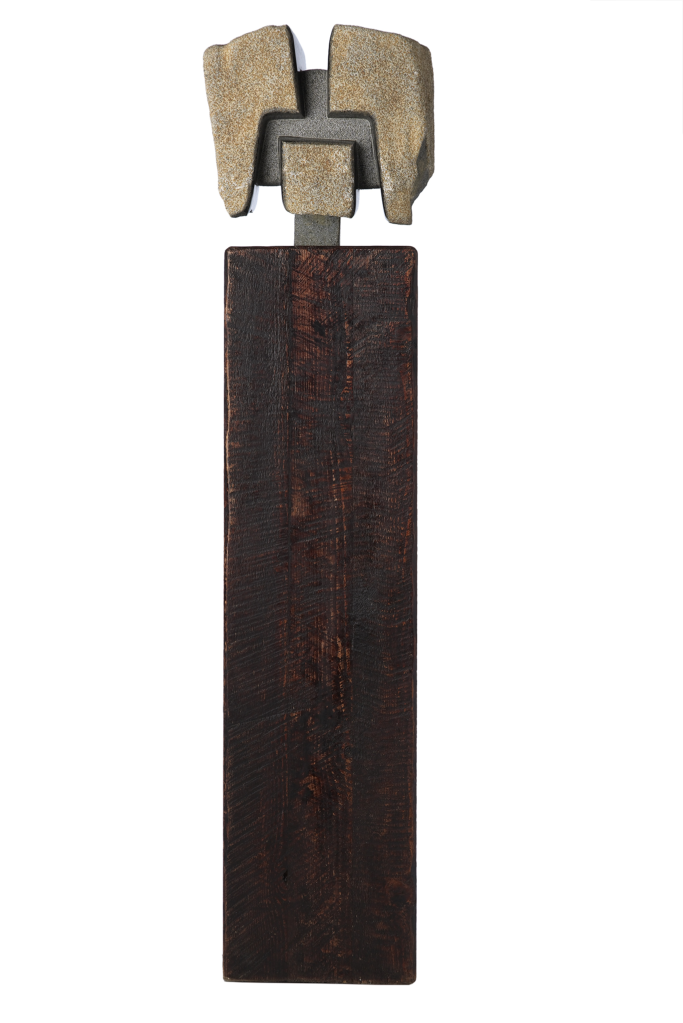 Pieza labrada en granito que está inserta en una peana de madera.