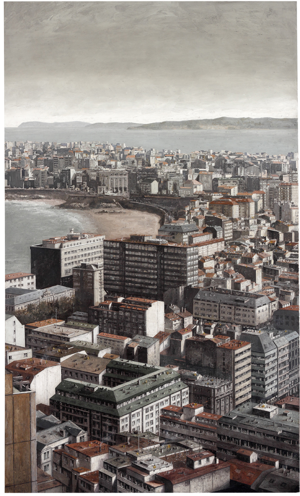 Una obra emparentada con su pintura paisajísta urbana, género que Jano Muñoz cultiva desde sus inicios como pintor. Construye una amplia panorámica de la bahía coruñesa tomada a vista de pájaro, a base de una peculiar paleta de grises y contrastes suaves, pintando el entorno con una fidelidad casi fotográfica.