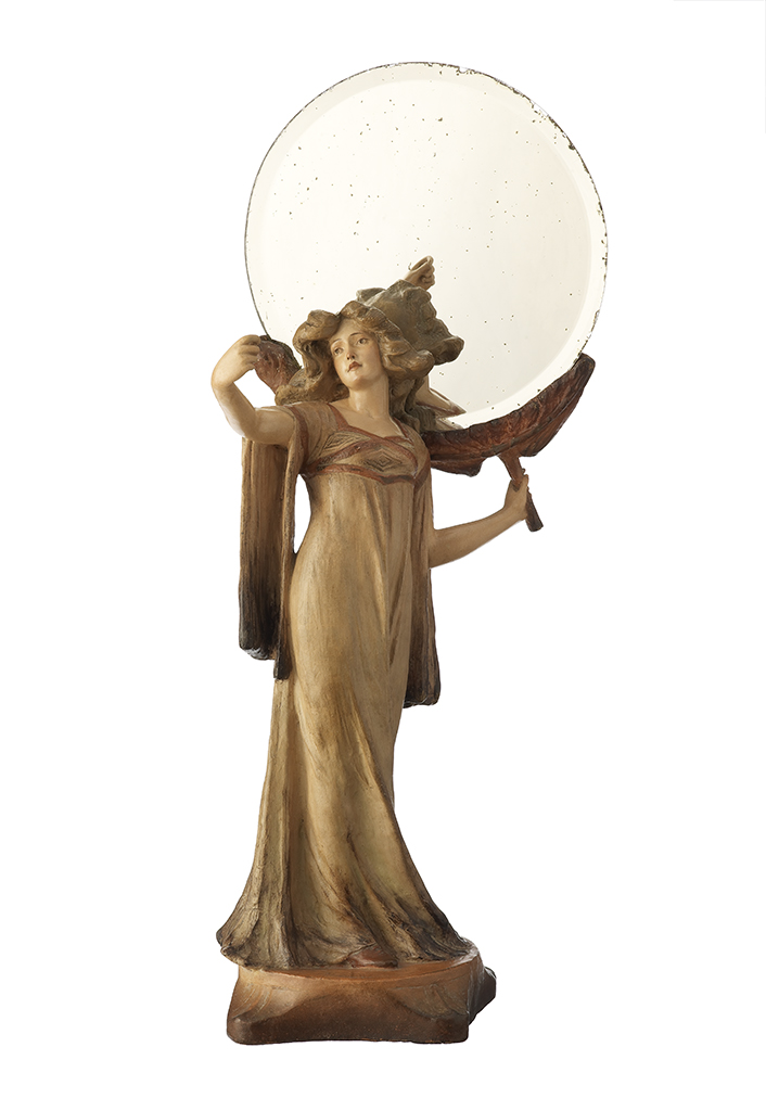 Figura femenina con una estilizada silueta que sostiene un espejo circular. La torsión del tronco y el movimiento helicoidal del cuerpo que parece girar sobre si mismo, imponen con fuerza las tres dimensiones.