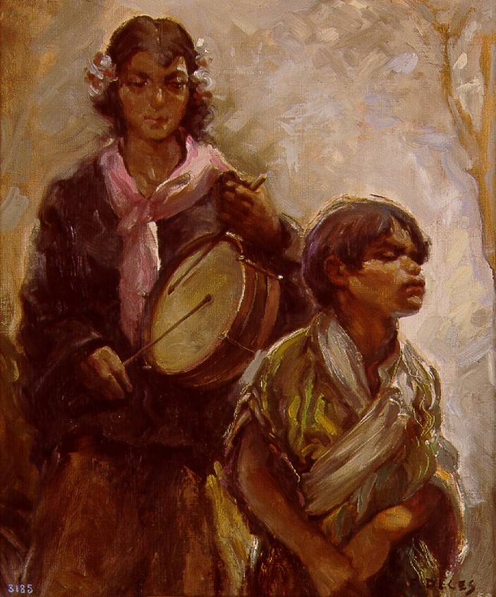 Escena de titiriteros en la que aparece en un primer plano un gitanillo que marca el compás del tambor, que está tocando detrás una gitana con flores en el pelo y un pañuelo anudado al cuello. El fondo es luminoso, y se aprecia un árbol.
