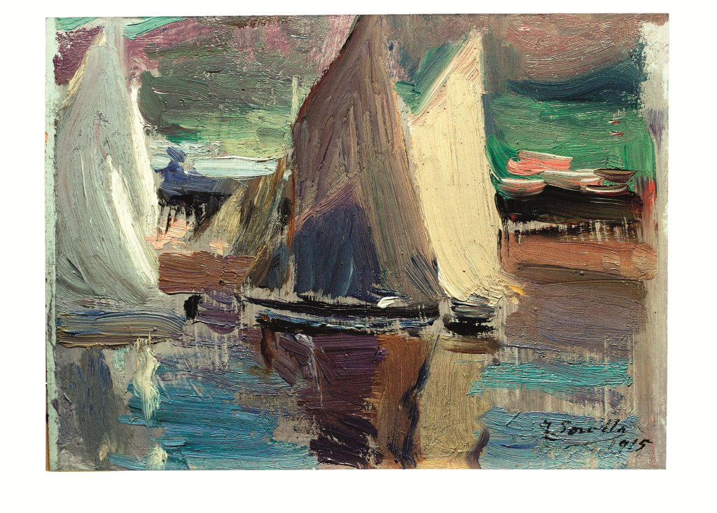 Imaxe: Descargar Escuchar Las velas Autores/as: Sorolla, Joaquín Cronología: 1915 Colección Museo Sorolla Varias barcas, con las velas desplegadas, avanzan, desde la izquierda y hacia la derecha, sobre las tranquilas aguas del mar. Sus formas se reflejan sobre la superficie del agua. Ejecución muy suelta y abocetada. Ficha técnica Número de inventario: 01117 Materia / Soporte: Cartón Autores/as: Sorolla, Joaquín Cronología: 1915 Clasificación: Pintura Medidas: Altura = 13,50 cm; Anchura = 17,80 cm Técnica: Pintura al óleo Objeto: Nota de color