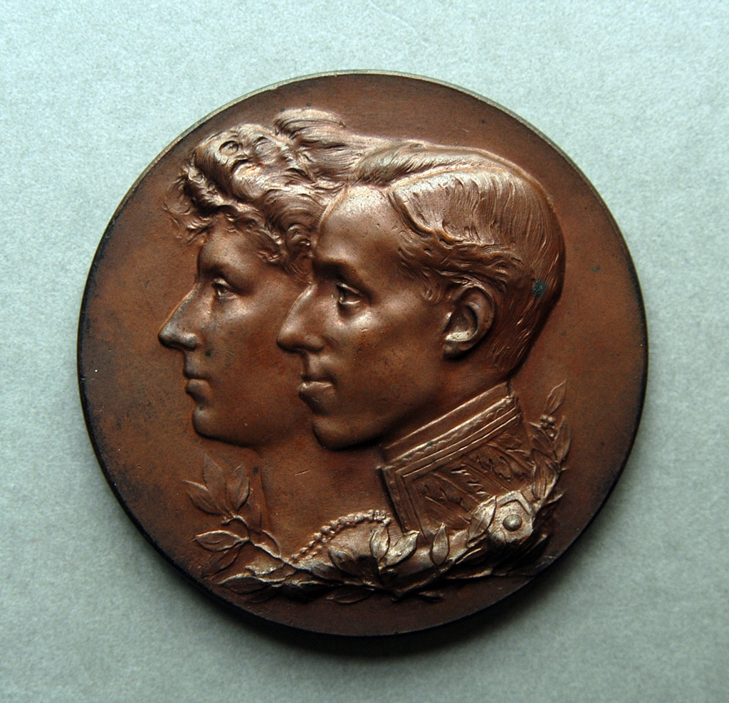 ANVERSO: Anepigráfico. Cabezas sobrepuestas del rey Alfonso XIII y de la reina Victoria Eugenia, debajo, dos ramas de laurel cruzadas.