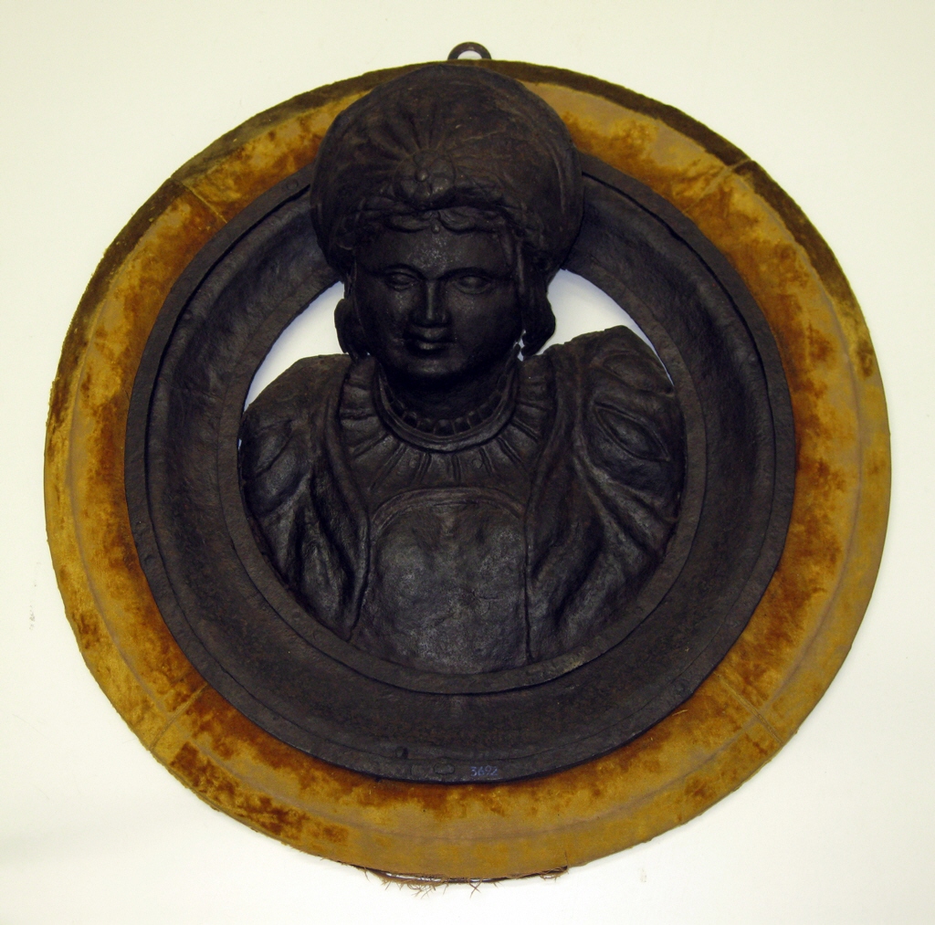 Medallón con un relieve de busto de figura femenina vestida al modo de la época con cuello de camisa subido y pelo recogido con un pañuelo cerrado con broche. Se cree que perteneció al arco de hierro donde estaban colocadas las lámparas encendidas ante el Apóstol, en el altar mayor de la catedral de Santiago de Compostela. En un principio las sostenía un viga de madera hasta que a mediados del siglo XVI se sustituyó por el llamado arco de las lámparas, de hierro y con variada decoración. El Maestro Guillén Bourse, rejero de origen francés, comienza esta obra en 1558 y la prosigue a su muerte Baltasar Ruz, probablemente francés, desde 1559 hasta 1560.