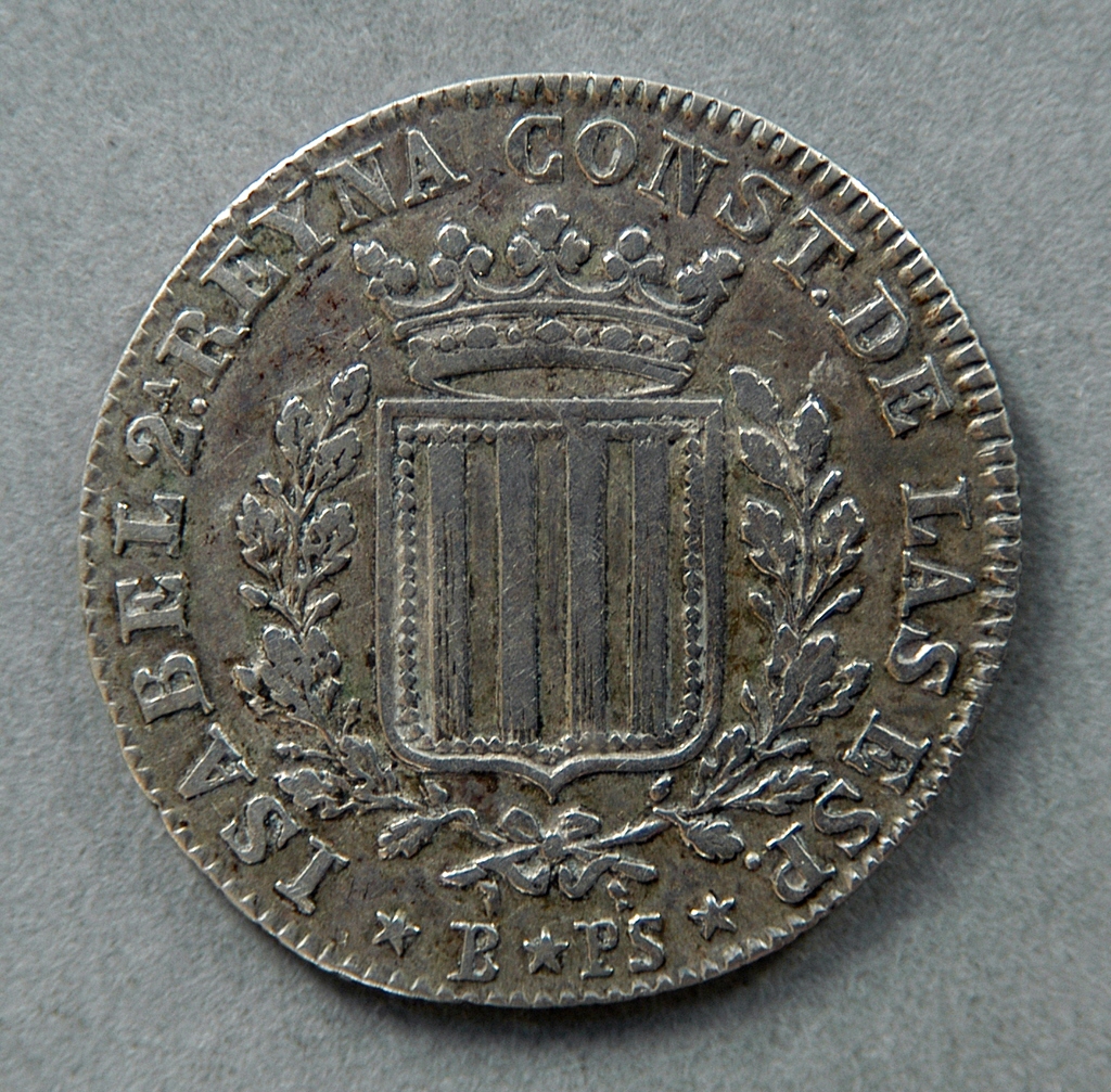 ANVERSO: ISABEL 2 ª REYNA CONST. DE LAS ESP / (estrella de cinco puntas) B, (estrella de cinco puntas) P S (iniciales de los ensayadores) (estrella de cinco puntas). Escudo de Barcelona bajo corona real y rodeado de corona vegetal.