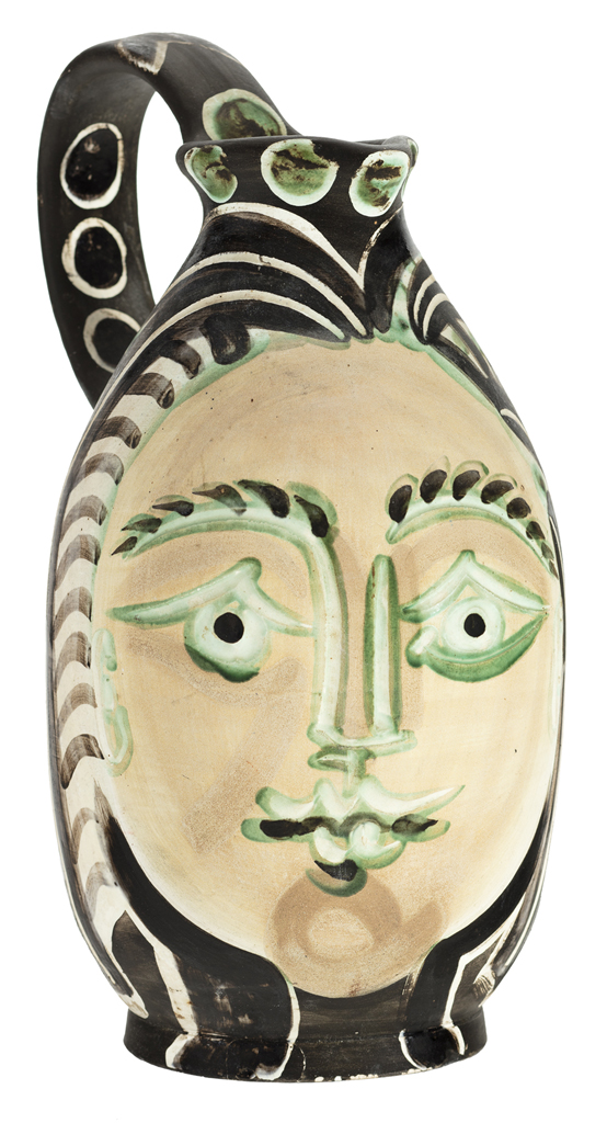 Jarra con decoración antropomorfa que reprsenta los rasgos de una cara humana. Policromada en marrón y verde esmeralda.
