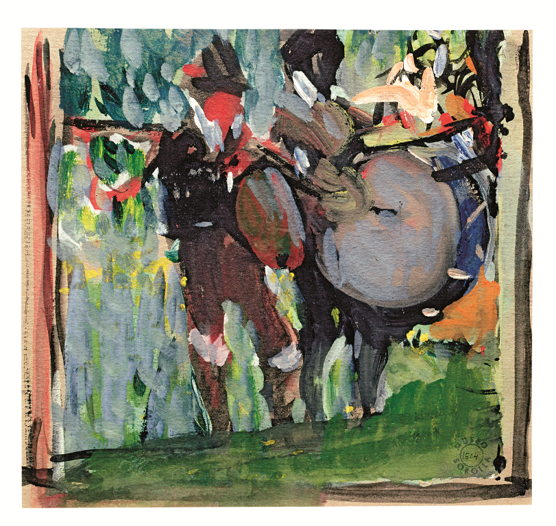 Un gaitero y su acompañante, con un bombo, muy esquematizados. Visten el característico traje regional y se recortan sobre paisaje, logrado a manchas.
