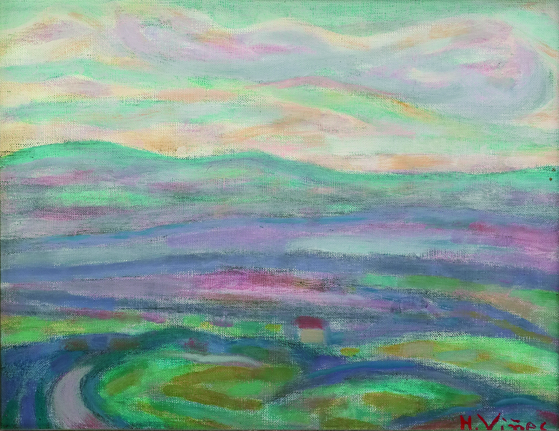 Pertenece a la llamada Escuela de París, y debido a esa formación parisina, el impresionismo, el fauvismo o el cubismo dejan una huella en su labor artística. A partir de los años cincuenta los contrastes lumínicos y cromáticos pasan a jugar un papel determinante en sus óleos, y en lo temático el paisaje se convierte en su centro de atención. La costa vasca, los Pirineos, la sierra de Madrid y la Provenza francesa, entre otros lugares, serán objeto de su mirada. Su paleta de tonos cálidos a base de rosas, azules, amarillos y violetas se plasma en toques rápidos y pinceladas superpuestas. Construye la perspectiva con la degradación de los colores hacia el fondo, en este caso los verdes del primer término van desapareciendo en profundidad.