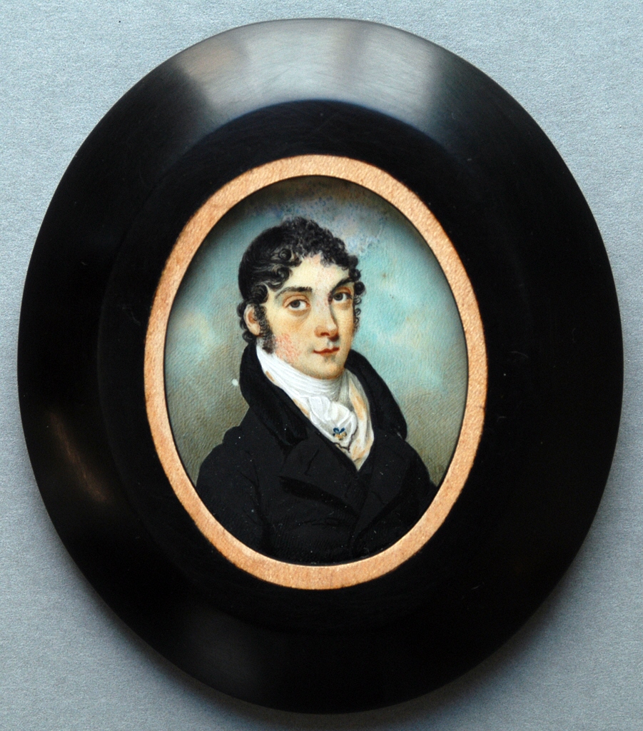 Retrato en forma ovalada de un joven, presenta el busto y casi en tres cuartos. Viste una levita negra y un amplio pañuelo blanco anudado al cuello, el pelo corto y rizo y unas grandes patillas.