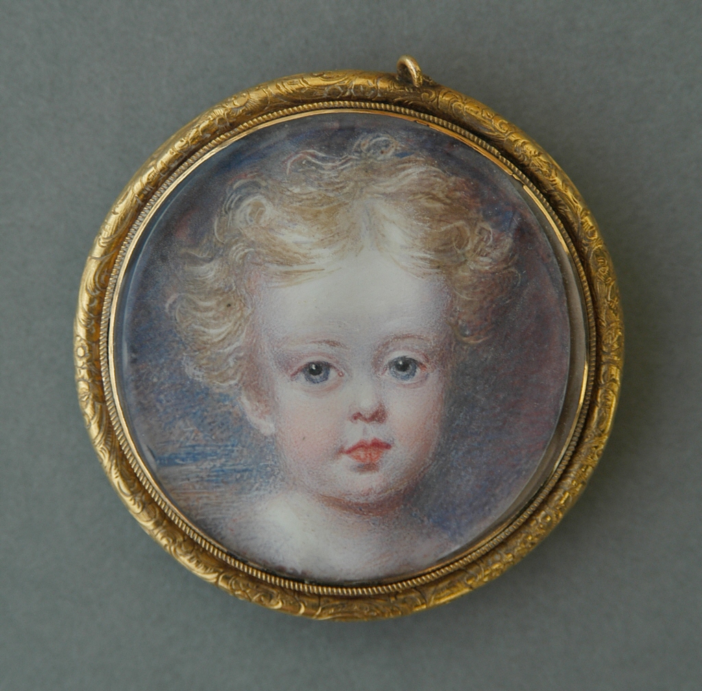 Colgante de oro grabado con miniatura en el interior y guardapelo en el reverso (contiene un mechón de cabello). Busto en tres cuartos de un niño hacia la derecha, se representa la cabeza con el cabello rubio alborotado y las mejillas sonrosadas.