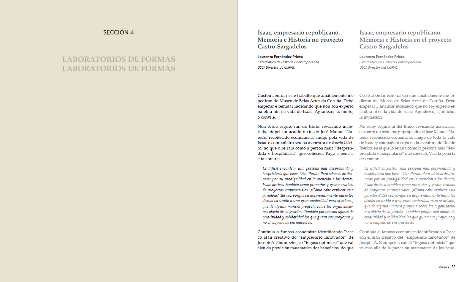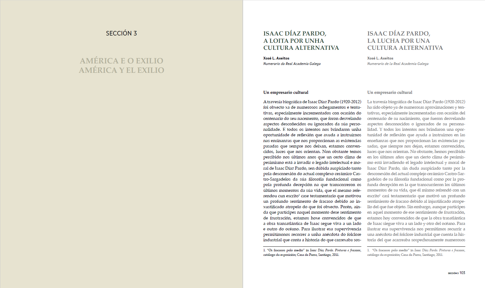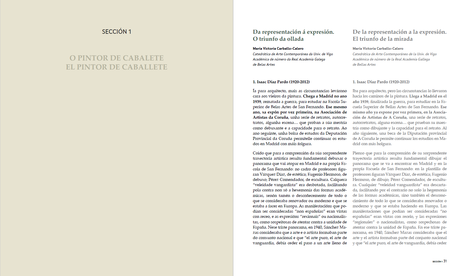 La publicación cuenta con los textos de Mª Victoria Carvalho Calero Ramos (escritora y crítica de arte y literatura), Juan Manuel Bonet Planes (exdirector del IVAM, del MNCARS y del Instituto Cervantes), Xosé Luis Axeitos (Académico de la RAG), Ruy Farías Iglesias (Universidad de Buenos Aires), Lourenzo Fernández Prieto (Universidad de Santiago de Compostela), Inmaculada Real López (Universidad Complutense de Madrid), y Antonio S. Río Vázquez (Universidade da Coruña).
