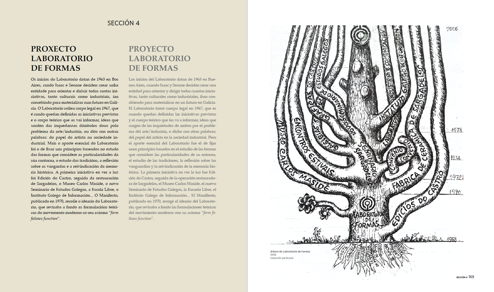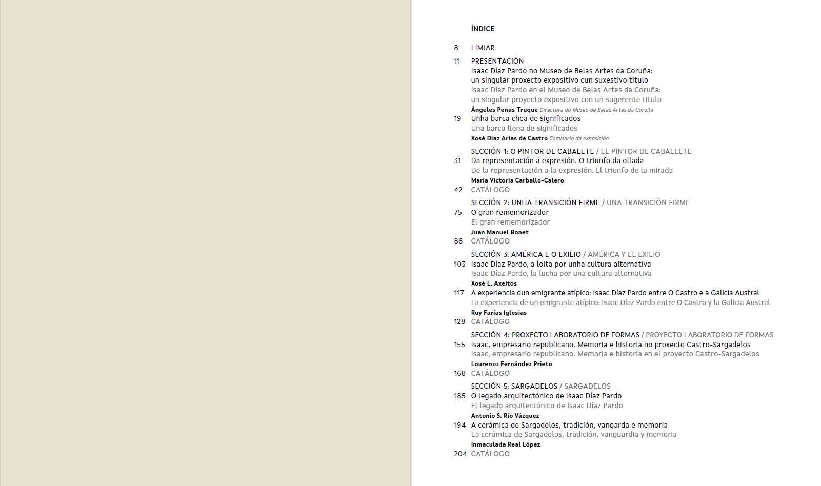 El catálogo se articula en torno a las cinco secciones en las que se divide la muestra, con las que se pretende mostrar la trayectoria vital de Isaac Díaz Pardo, desde su primera etapa pictórica hasta la última, diseñística e industrial, pasando por la etapa de transición plástica y la del estudio y puesta en práctica de las señales que trasmite la tradición y la memoria, con la creación del Laboratorio de Formas de Galicia y sus proyectos.
