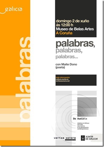 Maite Dono voz/ Pablo Coello saxofón baixo/ Rubén Barros guitarra eléctrica/ Diego Ventoso percusión/ David Durán piano/ Ángel Faraldo electrónica e difusión multimedia __________________________________________________________________________A música contemporánea dialoga coa arte, coa ciencia e co pensamento no Ciclo de Concertos Do Audible[23/05/2013] A través de catro sesións, Do Audible ofrece propostas musicais de vangarda que interaccionan con diferentes campos da expresión e do pensamento, como a palabra, o visual, a natureza e a arquitectura.