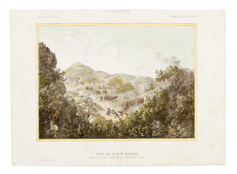 Escena de guerra na que os dous bandos en loita se distribúen polas ladeiras das montañas. Forma parte da serie El Mundo Militar (1859-1863), publicación fundada e dirixida por Mariano Pérez de Castro.