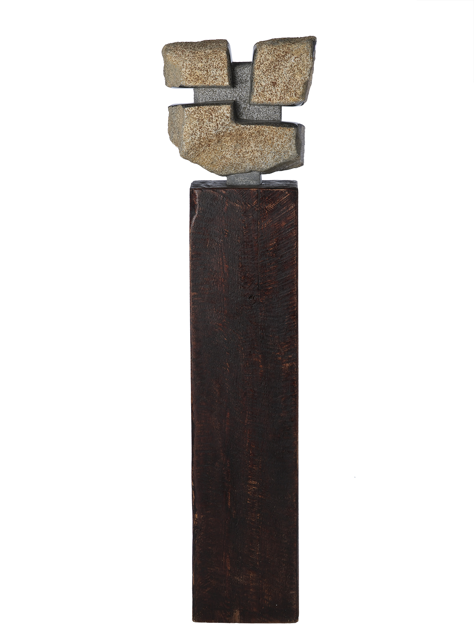 Peza labrada en granito que está inserta nunha peaña de madeira.