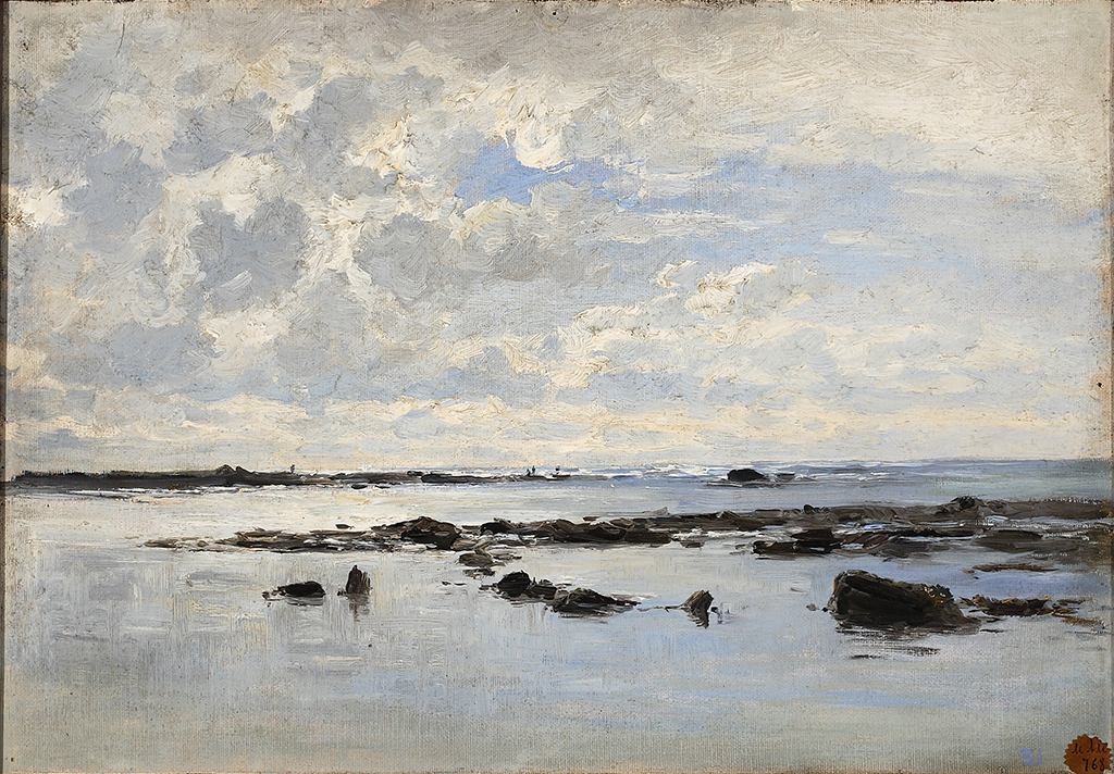 O tema, é un tramo calquera de costa non identificable, soamente a forma das pequenas rocas estratificadas que emerxen coa baixamar poderían ser afíns ao perfil rochoso do litoral de Guethary. Con todo, son escasos os cadros en que Haes non deixa, aínda que mínima, unha pegada de humanización ou presenza do home; estacadas, barcos, carreiros ou diminutas figuras enfaenadas nalgunha actividade. Neste caso son as siluetas duns pescadores apenas percibidos sobre a lengüeta de terra próxima á liña do horizonte os únicos referentes que humanizan esta paisaxe costeira.
