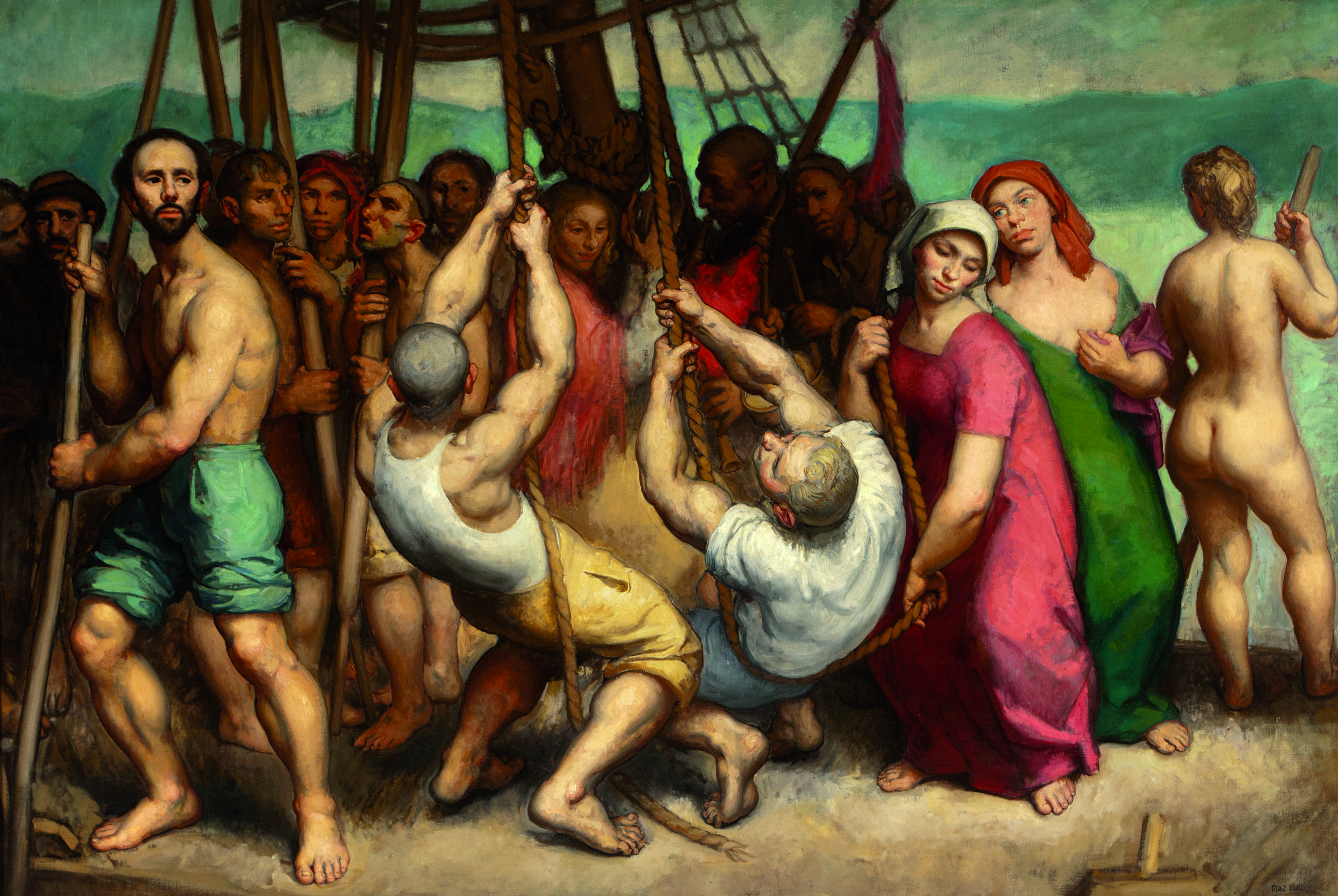 Imaxe: Descargar Escoitar A Barca de Caronte Autores/as: Díaz Pardo, Isaac Cronoloxía: 1946 Folla técnica Materia / Soporte: Lenzo Autores/as: Díaz Pardo, Isaac Cronoloxía: 1946 Procedencia: Colección de Arte ABANCA Medidas: 215 x 320 cm Técnica: Pintura ao óleo