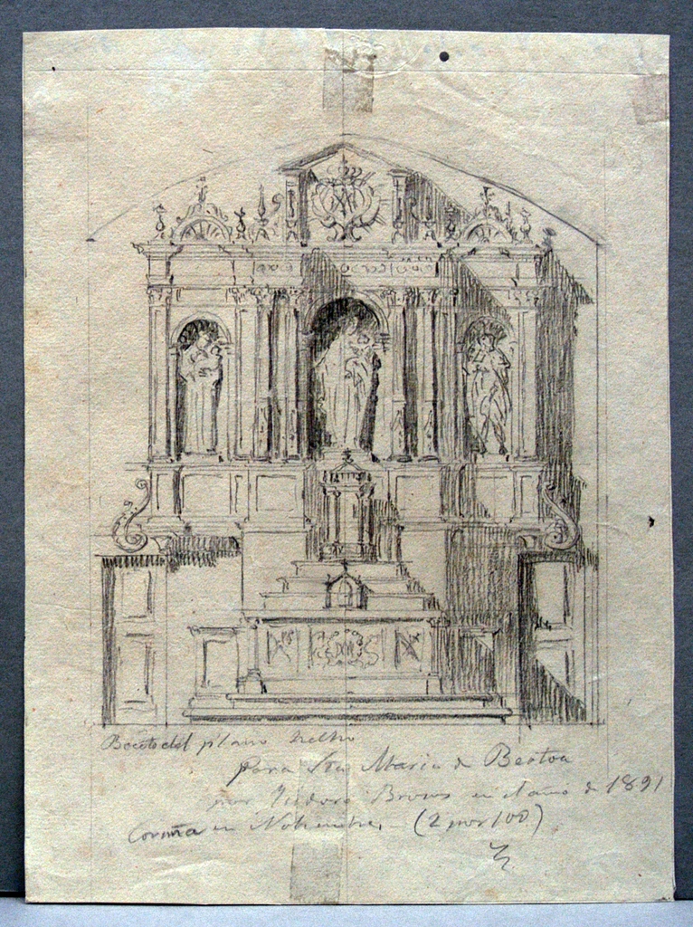 Bosquexo de retablo para a igrexa de Santa María de Bértoa (Carballo, A Coruña). Retablo neoclásico con banco liso e un corpo central con tres rúas, cunha figura relixiosa en cada rúa: a central, Virxe co neno. Remate con frontóns, o central triangular e os laterais semicirculares. En primeiro plano o altar, flanqueado por dúas portas.