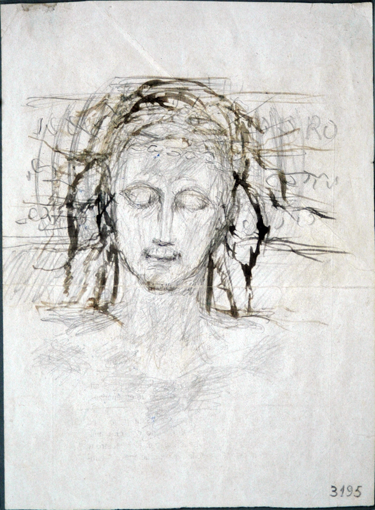 Rostro masculino debuxado a lapis, cos ollos pechados e lixeiramente barbado. Todo isto enmarcado por uns trazos a tinta que indican o cabelo ou algo que envolve a cabeza.