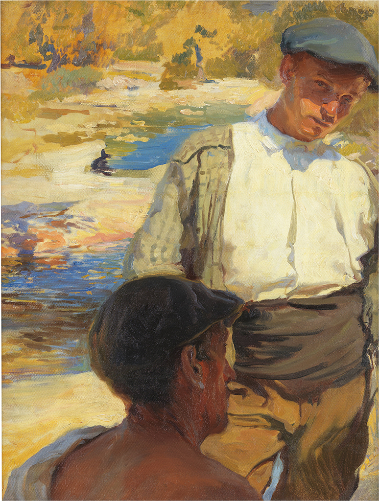 Dúas figuras masculinas situadas nunha paisaxe bañada pola luz do sol, con vestimentas populares e boinas. Unha delas mira ao espectador.