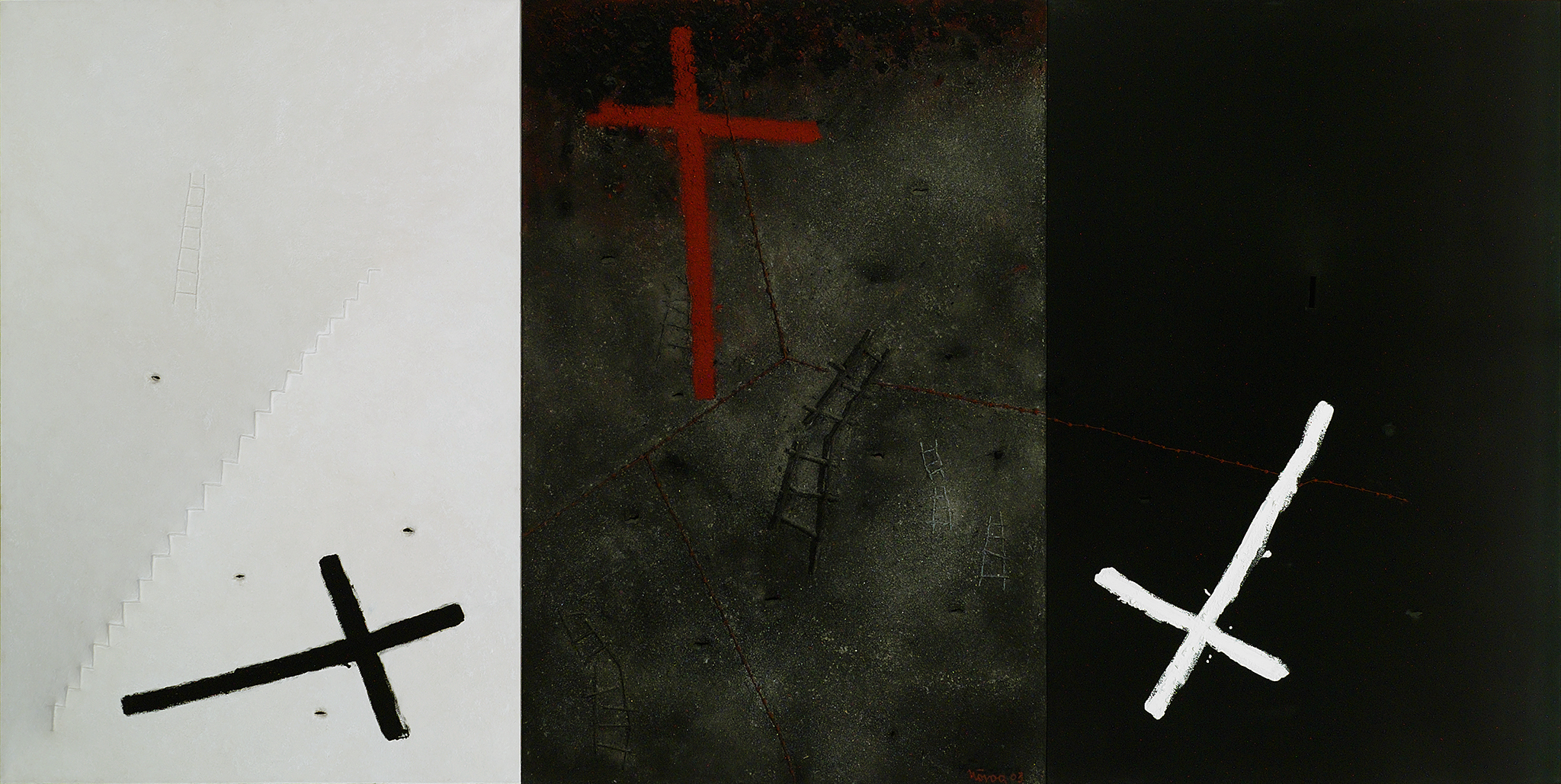 Esta obra inscríbese dentro da linguaxe informalista que desenvolveu Nóvoa desde mediados dos anos sesenta, introducindo elementos escultóricos tanto na súa obra pictórica como nos murais. É un tríptico formado por tres lenzos nos que se alternan as cores branca, negra e gris, destacando en cada lenzo unha cruz. Outros dous obxectos recoñecibles inscritos na materia son unha escaleira de man e outra escaleira. A peza constrúese a partir de materiais como cinza, area, arames ou pedras coas que realiza un xogo de texturas na procura da tridimensionalidade.