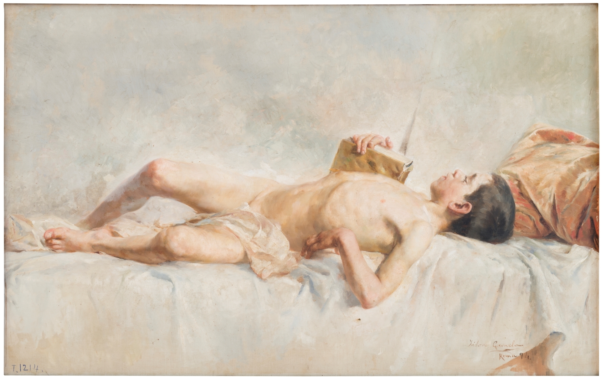 Figura de adolescente tendido sobre unha cama. Suxeita un libro coa man dereita e a outra lévaa á cintura. A cama está cuberta cunha gran saba branca e almofada con funda dourada. O fondo neutro claro, enlaza coa cor branca da saba, rompendo toda sensación de separación e profundidade.