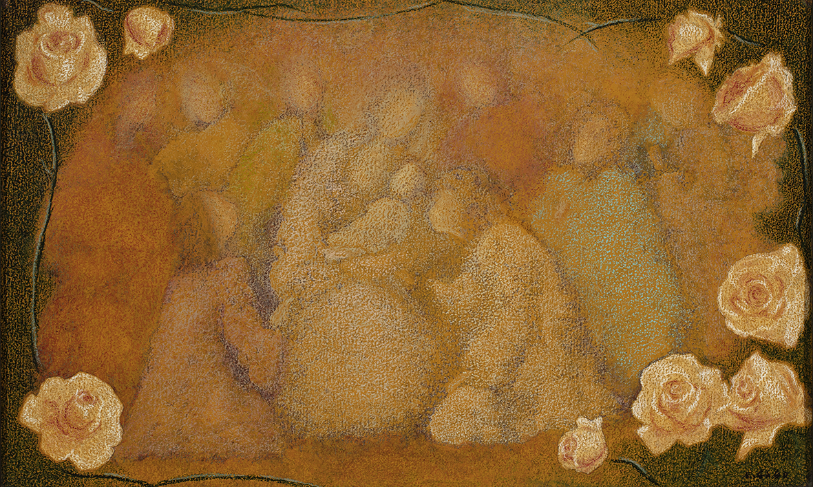 Un grupo de persoas colócanse arredor da protagonista cun neno en brazos que semella representar a adoración do neno Xesús. O fondo é neutro e cálido e rodéanse por unha especie de roseira con rosas brancas e rosadas.