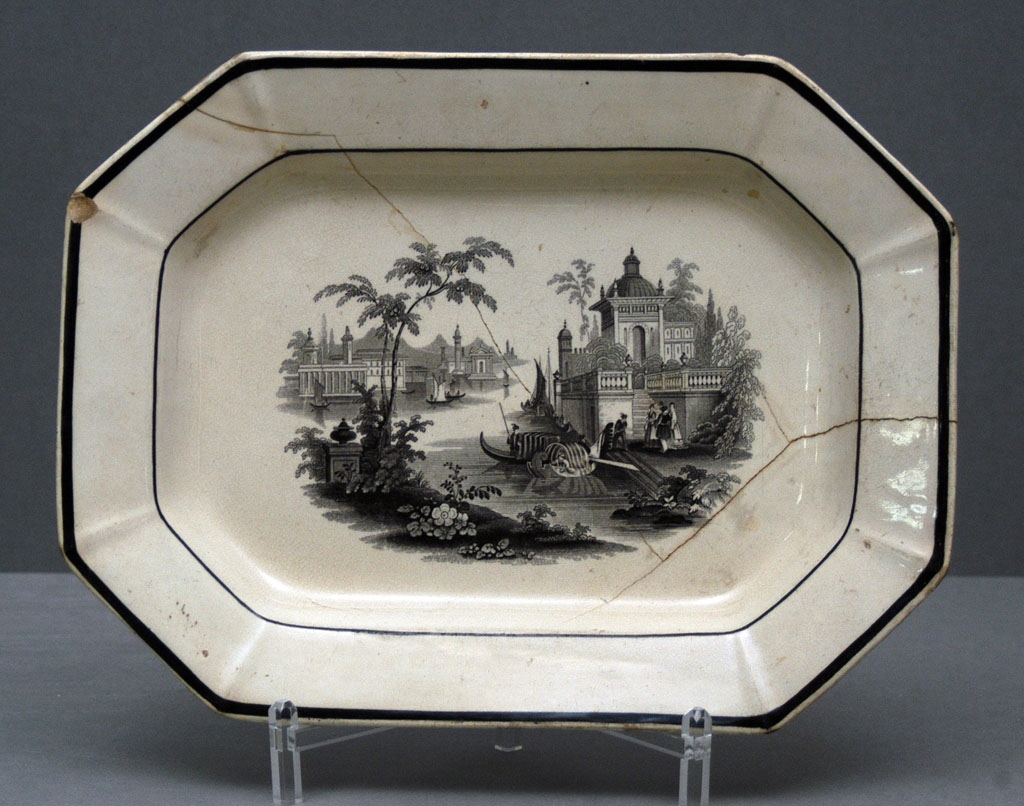 Fonte cuadrilonga con á fileteada en negros de distinto grosor e o centro decorado con vista idealizada dun lugar. A disposición compositiva responde ao esquema común neste tipo de viñetas: unha canle central, con diversas embarcacións e góndolas, organiza os distintos elementos da paisaxe. En primeiro plano un espazo axardinado con árbore de gusto romántico, que exerce un contrapunto compositivo respecto da grande edificación cupulada máis alá do río. Ao pé da escalinata diversos personaxes con vestimenta de época e ao fondo, máis edificacións de carácter clasicista acentúan a sensación de distancia.
