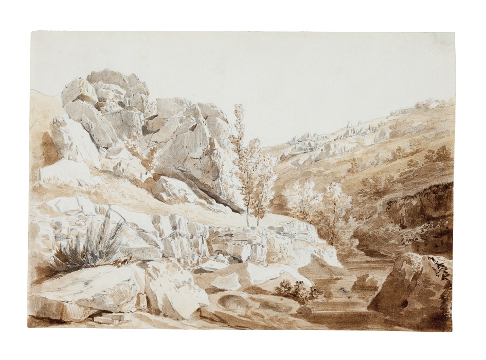 Paisaxe de serra. Un pequeno río discorre pola dereita entre rochas descarnadas con vexetación en zonas puntuais.