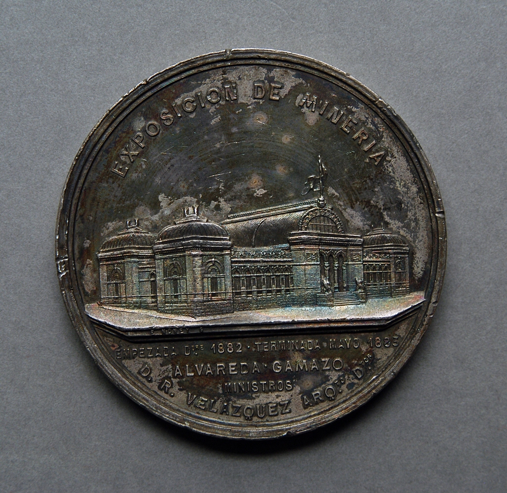 ANVERSO: EXPOSICIÓN DE MINERIA. Debaixo, vista exterior do palacio de Belas Artes. Debaixo, E. NONEY G. No exergo EMPEZADA Dbre. 1882 ·TERMINADA MAYO 1883 / ALVAREDA · GAMAZO / MINISTROS/ D. R. VELAZQUEZ ARQto. Dtor.