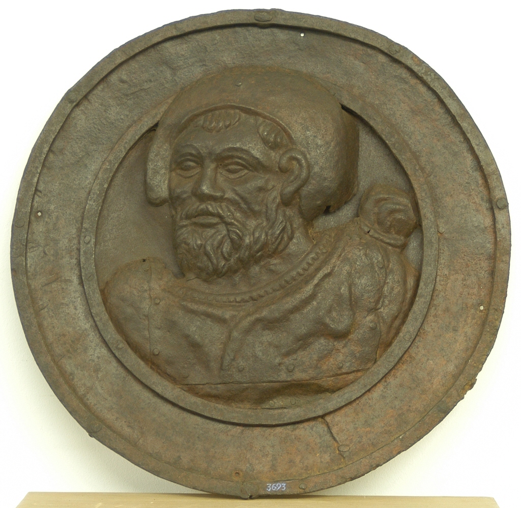 Medallón cun busto en relevo de personaxe masculino barbado e con gorro que lle cobre a cabeza. Crese que pertenceu ao arco de ferro onde estaban colocadas as lámpadas acesas ante o Apóstolo, no altar maior da catedral de Santiago de Compostela. Nun principio sostíñaas unha trabe de madeira ata que a mediados do século XVI foi substituída polo chamado arco das lámpadas, de ferro e con variada decoración. O mestre Guillén Bourse, reixeiro de orixe francesa, comeza esta obra en 1558 e proséguea á súa morte Baltasar Ruz, probablemente francés, desde 1559 ata 1560.