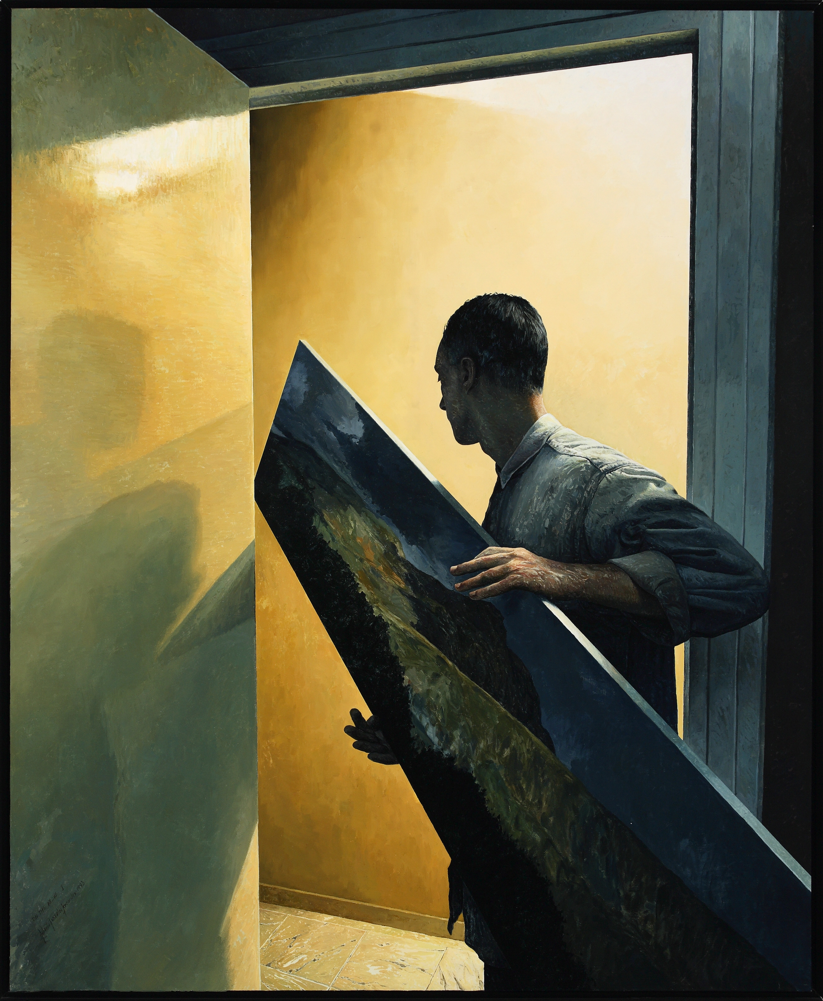 Primeiro lenzo da serie composta por nove cadros, OTM (On the move I-IX), que conforman unha secuencia na que o autor, que é o protagonista da súa propia obra (autorretrátase), preséntanos o traslado dun cadro dunha habitación a outra do seu estudo a través dunha escaleira interior para atopar unha adecuada perspectiva. Paralelamente, somos testemuñas de todo o proceso creativo, pois o cadro que transporta, pasa de ser unha mancha abstracta a unha imaxe nítida. Este cadro é Holyrood I, a paisaxe de Edimburgo que foi obxecto protagonista dunha serie do mesmo nome e antecesora de On the move. Roberto González realiza así unha inflexión sobre aspectos como o tempo, o movemento, ademais de establecer relacións co cinema e a fotografía. As arquitecturas tamén se manteñen como unha presenza importante, configurando un escenario xeometrizado e estático. Baixo unha particular concepción da representación, a súa obra converteuno nun dos grandes representantes do hiperrealismo pictórico.