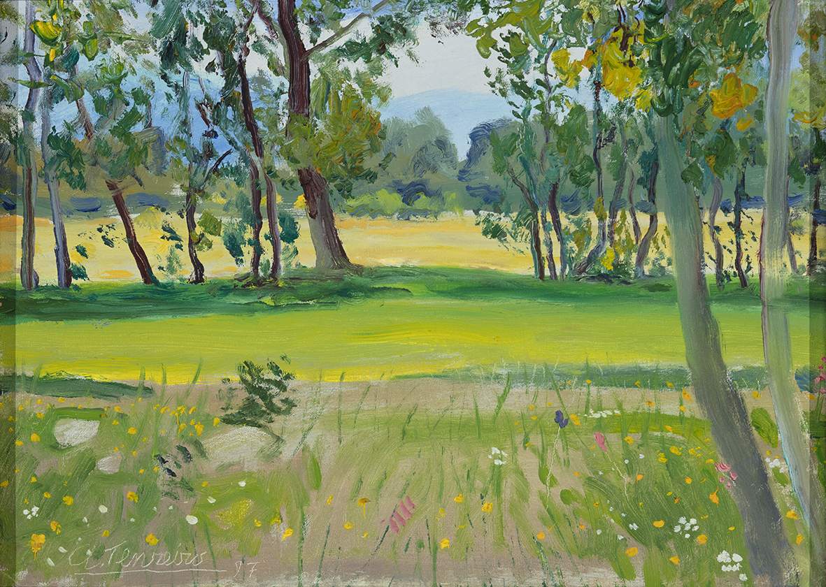 Paisaxe con herba e flores en primeiro plano, unha ringleira de árbores e ao fondo unha zona boscosa que cobre parcialmente un relevo montañoso.