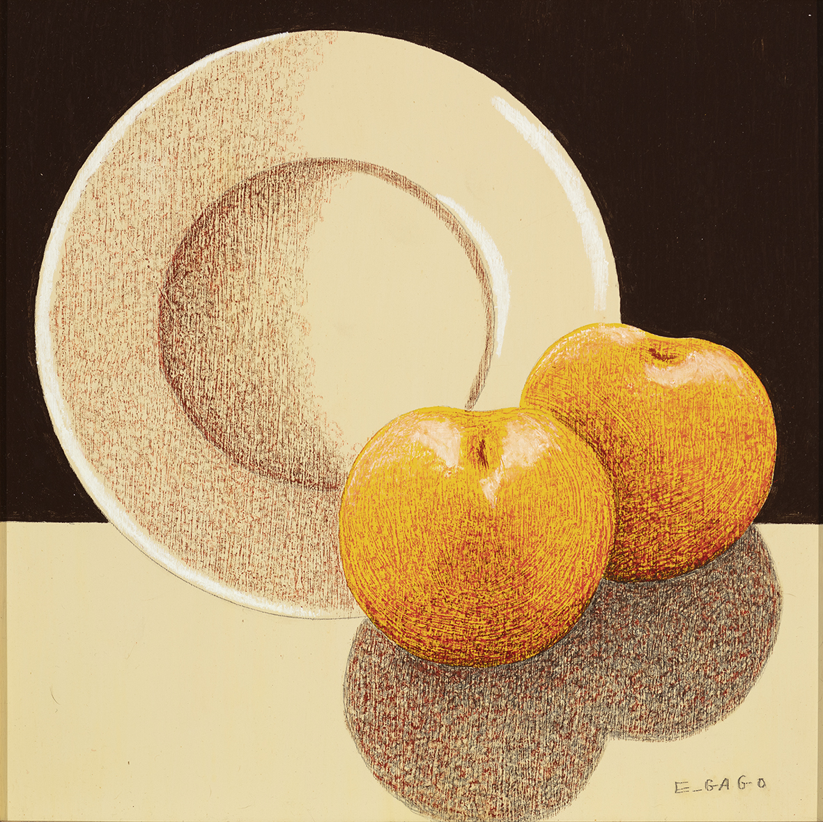 Imaxe: Descargar Escoitar Pexegos con prato Autores/as: Gago, Elena Cronoloxía: 1985 [ca] - 1990 [ca] Bodegón con dous pexegos e un prato detrás máis elevado, todos os elementos colócanse sobre unha mesa e ante un fondo neutro. Folla técnica Número de inventario: 6479 Materia / Soporte: Tablex Autores/as: Gago, Elena Cronoloxía: 1985 [ca] - 1990 [ca] Clasificación: Pintura Iconografía: Bodegón Procedencia: Doazón de Elvira Álvarez Vega Medidas: 30x30 cm Técnica: Pintura ao óleo Obxecto: Cadro