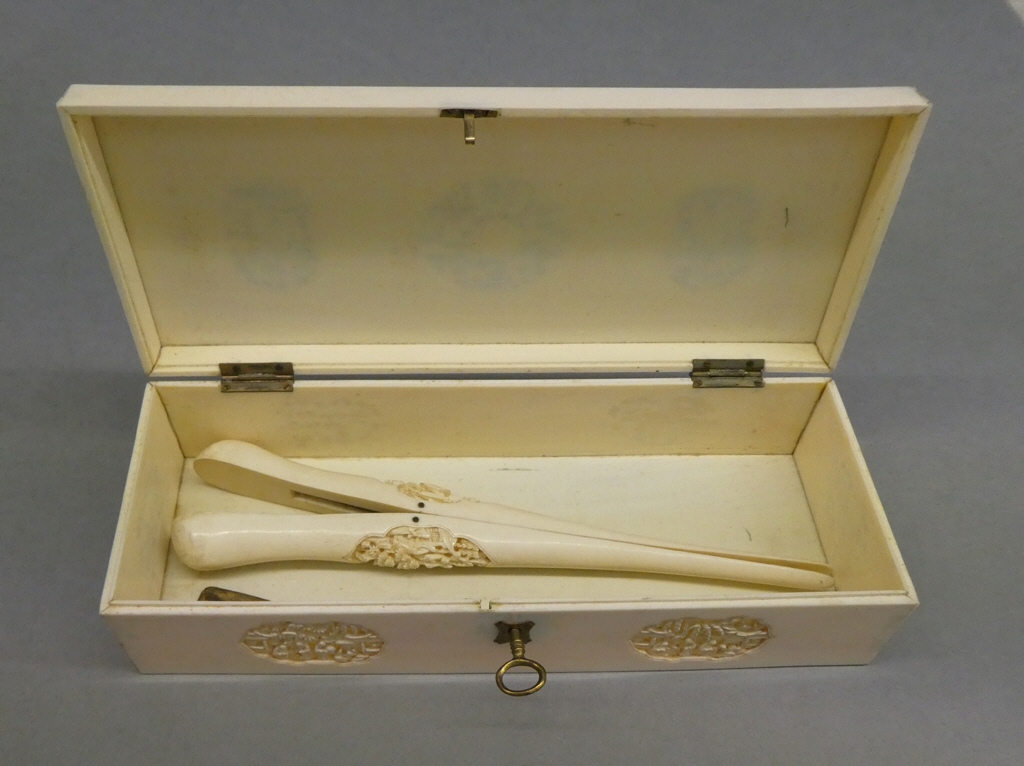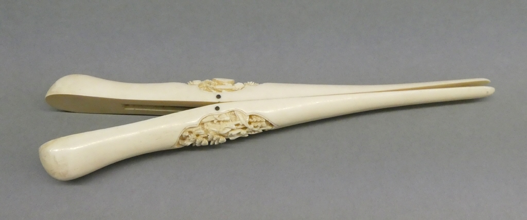 Pinzas de marfil que servían para estirar os dedos das luvas, especialmente os de pel. Cada un dos brazos está decorado cun medallón que contén motivos tallados de ramas e flores.