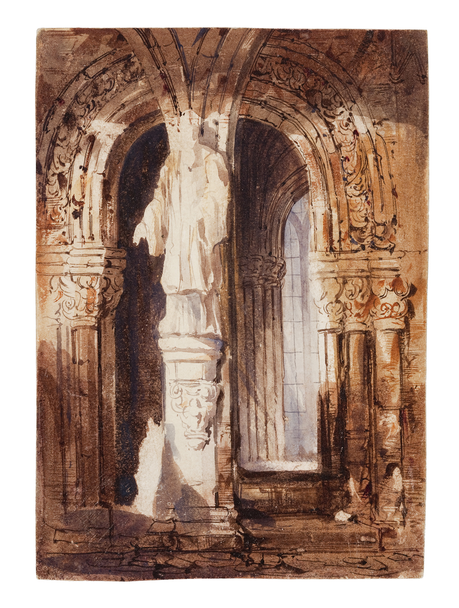 Vista do pórtico dunha igrexa románica. En primeiro termo vese un parteluz que sostén unha escultura sobre un pedestal. Ao fondo, interior do templo. Todo en tons ocres.