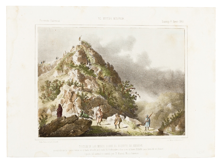 Na cima e ao pé dunha montaña, con escasa vexetación, varias figuras que portan armas vixían e montan garda. Forma parte da serie El Mundo Militar (1859-1863), publicación fundada e dirixida por Mariano Pérez de Castro.