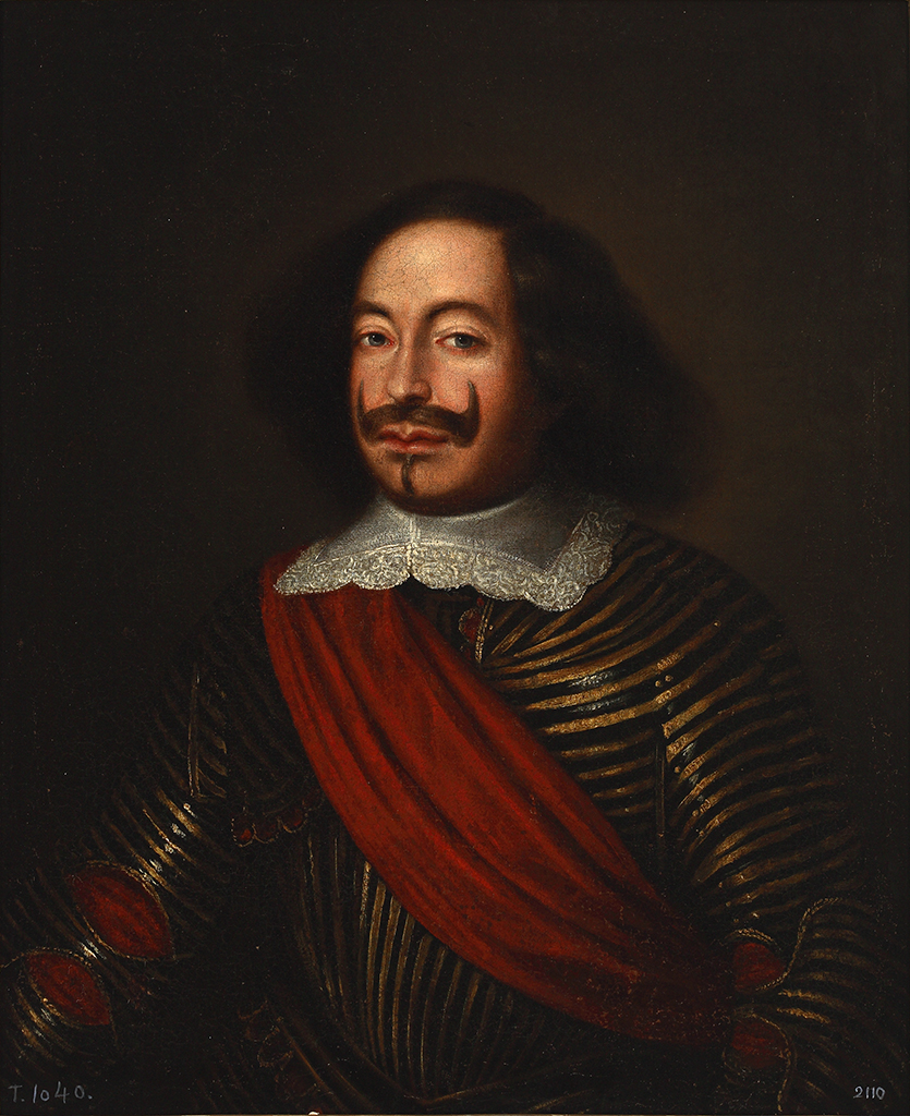 Retrato masculino de medio corpo ladeado cara á esquerda do espectador. Valona almidonada e banda. Pelo recortado en forma de melena con bigote e perilla. Traxe en negros e dourados. Fondo en terras.
