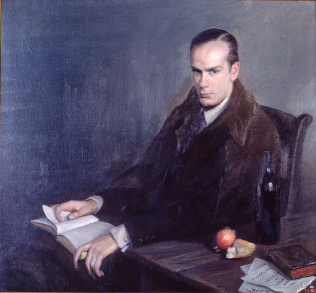 Retrato en tres cuartos do literato Camilo José Cela, sentado nunha cadeira cun libro aberto entre as mans. Represéntase novo e elegante, vestido con traxe escuro, gravata e capa marrón sobre os ombreiros. Apoia o cóbado esquerdo sobre unha mesa de madeira onde se situan unha cebola, pan e unha botella, ademais dun libro e unhas cuartillas nas que se pode ler: Camilo José Cela / La Familia de Pascual Duarte. O protagonista fita ao espectador.