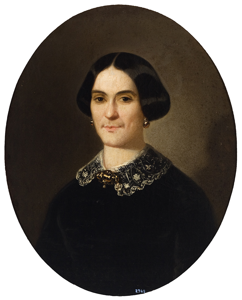 Retrato de señora de medio corpo, de fronte e lixeiramente ladeada cara á dereita. Recolle o pelo nun moño e viches un traxe negro co pescozo de encaixe e un gran adorno a modo de peche. O fondo é neutro e escuro e o formato é ovalado.