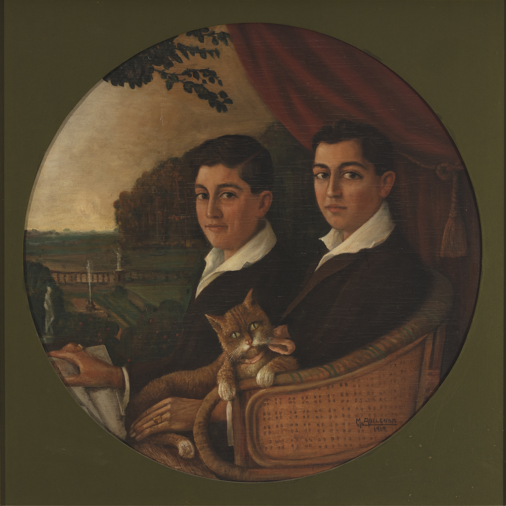 Retrato de medio corpo de dous mozos sentados nunha cadeira de brazos de vimbio, un suxeitando no seu colo un gato e o outro un libro. Ambos aparecen enmarcados por un cortinón vermello á dereita e no fondo por unha paisaxe con esculturas clásicas.