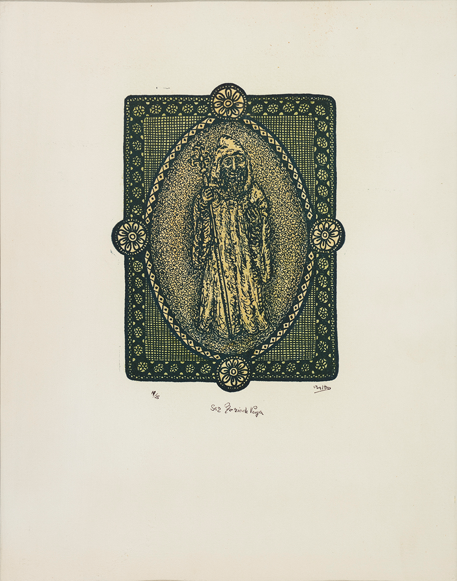 Imaxe: Descargar Escoitar San Munio de Veiga Autores/as: Baltar, Arturo Cronoloxía: 1965 [ca]-1970[ca] Folla técnica Número de inventario: 6537 Materia / Soporte: Papel Autores/as: Baltar, Arturo Cronoloxía: 1965 [ca]-1970[ca] Clasificación: Artes gráficas. Estampaxe Iconografía: Relixiosa. Santos Procedencia: Doazón de Elvira Álvarez Vega Medidas: 385x300 mm Técnica: Litografía Obxecto: Estampa