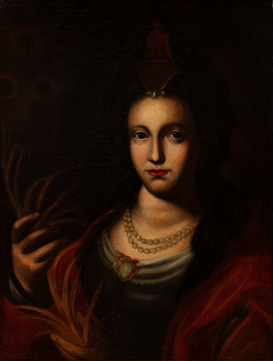 Esta figura retratada de busto podemos identificala con Santa Bárbara cuxa lenda popularizou na idade media a Lenda Dourada de Santiago de la Vorágine. A santa cóbrese cun manto vermello que simboliza o sangue do sacrificio de Cristo e adórnase con algúns aderezos luxosos como o colar de contas ou o refinado tocado que lle coroa a cabeza segundo a moda da época. Con expresión serena, observa de maneira directa ao espectador cos símbolos do seu triunfo: as palmas que suxeita nas mans que son atributo do martirio dos santos; o cáliz coroado pola sacra forma representado minuciosamente no broche de peito que adorna o vestido para simbolizar a súa conversión ao cristianismo e que a sinala como intercesora nas mortes súbitas sen confesión, nin comuñón e como auxiliadora e patroa dos moribundos; finalmente o seu atributo distintivo, a construción que está situada detrás da figura, unha torre na que hai tres ocos ou xanelas circulares que simbolizan a súa adoración á Santísima Trindade. Segundo a lenda, o pai da santa para apartala da evangelización cristiá encerrouna nunha torre iluminada por dúas xanelas, pero ela conseguiu recibir os ensinos cristiáns e ser bautizada e para expresar a súa fe fixo abrir unha terceira xanela.